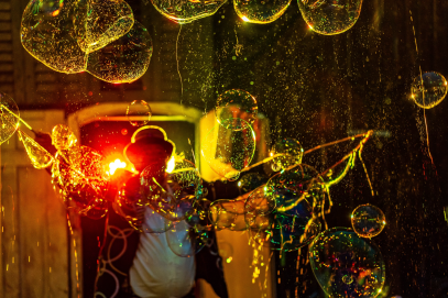 Seifenblasen scheinen im Dunkel der Nacht eine noch magischere Ausstrahlung zu haben als bei Tageslicht. Anlässe dafür gibt es genug. Ob im Sommer oder Winter, ob "Flammende Sterne", "Sternschnuppennacht", Strassenfest, lange Einkaufsnächte oder auf sonstigen Lichterfesten. Der WOW - Effekt wird noch größer und die Lichtquellen spiegeln sich tausendfach in den Blasen. Lichtgeschwindigkeit scheint neu erfunden. In wabernden Blasen reisen Licht und Farben, langsam durch die Nacht. Auch auf Hochzeiten werden die illuminierten Seifenblasenshows immer beliebter. Falls keine eigenen Lichtquellen vorhanden, bringen wir genügend Teelichter und LED Strahler mit, damit die Seifenblasen dann auch im Dunkeln, funkeln.